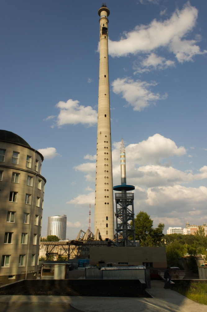Возможно, вам покажется серая недостройка ничем ни примечательной. Это Телебашня в Екатеринбурге, жертва перестройки и "символ" Екатеринбурга. На заднем фоне видна действующая телевышка для Екатеринбурга. Напоминает нашу.