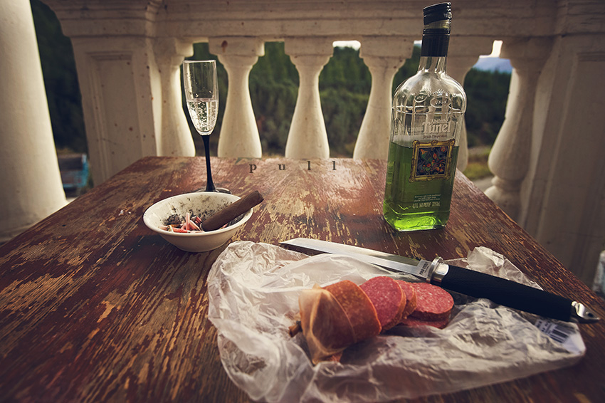 Европейский напиток, типа - восточный нож, колбаса, пакетик из продмага, газ вода, бокал для шампанского, огрызки сигарет с помадой и сигара - ГармонияААААААААААААА!