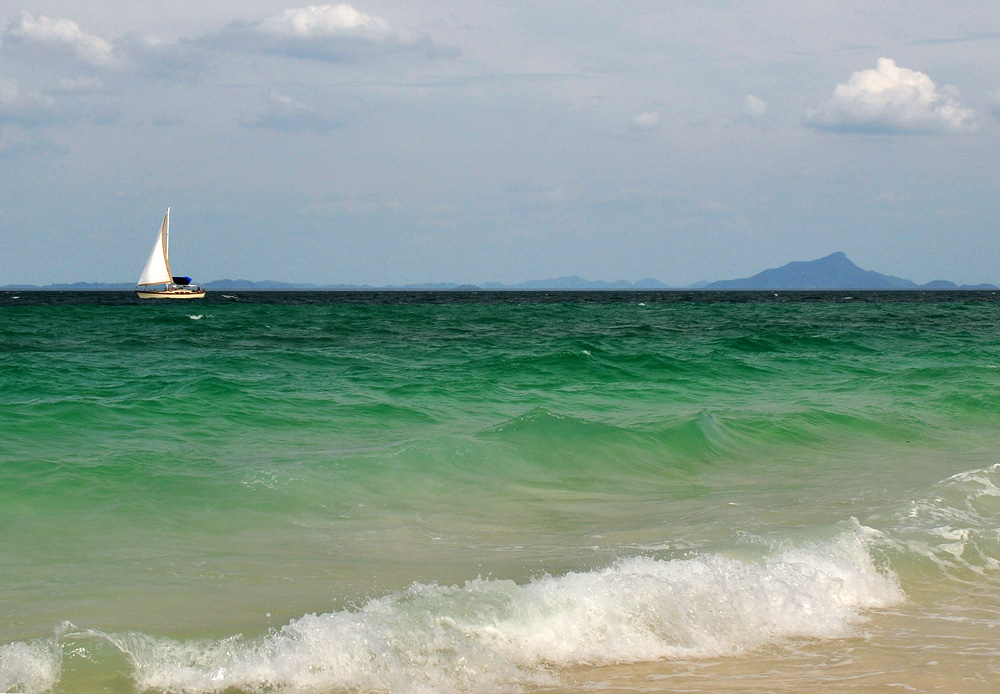 В тот день с моря дул сильный ветер и вода была неспокойной, но на экскурсию мы уже были записаны. Снорлинга мы, конечно, не увидели, зато на одном из островков был белоснежный песок и необычаянно изумрудные пенные волны. На небе было полно мелких кучевых облачков, а морской пейзаж дополнял парусник.