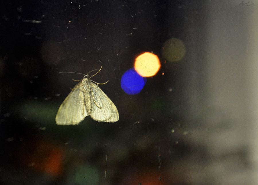 летящий на свет настольной лампы в моем окне.