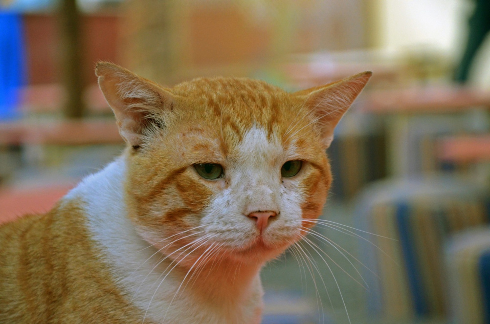 классное фото. У кота "лицо" именно такое- с грузом тяжелой бродяжьей жизни за плечами, но умиротворенное и спокойное от той сытой жизни, в какой он находится сейчас.