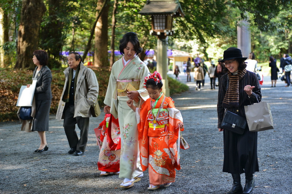 Попал на праздник "посвящения ребёнка, куда-то". Мамы девочек с малолетства учат правильно ходить. Вся фишка, что бы кимоно при движении не распахнулось, да и в деревянных туфлях по гравию, не очень то. Вот и идут - взрослые довольны о "посвящении ребёнка", а девочке - скорей бы до дома дойти.