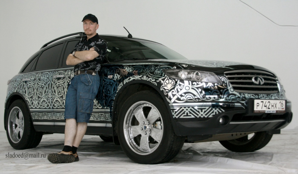 Работа получила Гран-При на Автоэкзотике, орнамент выполнен зеркально-серебрянным, по краям орнамента серебро чернёное.
