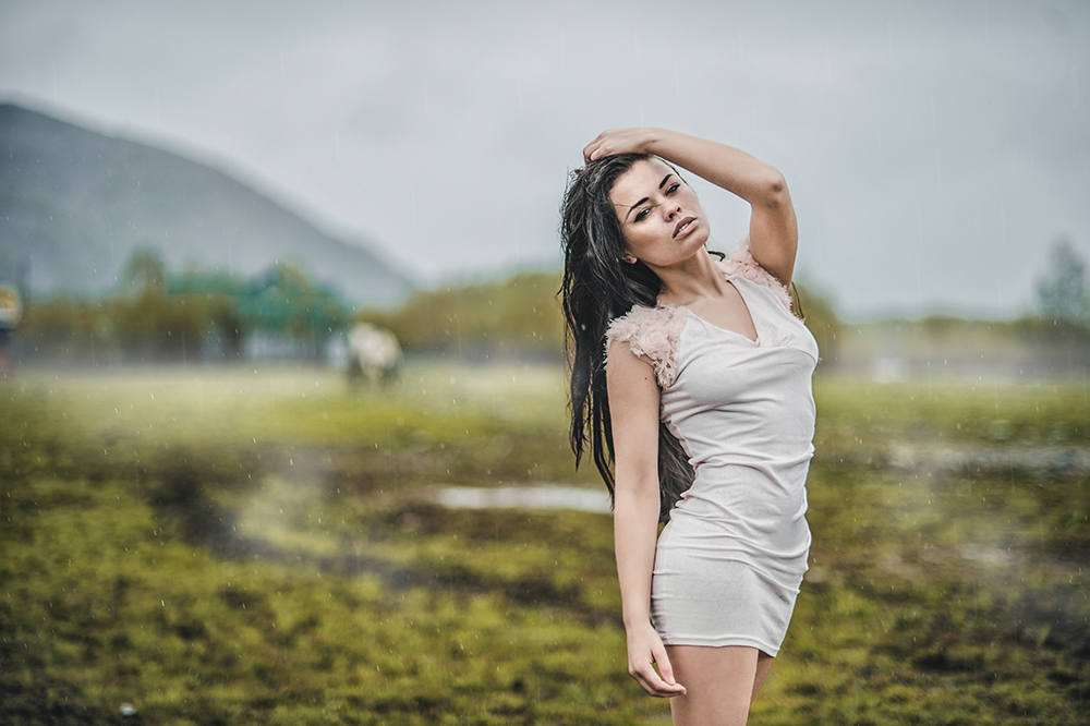 Это даже ни как бы дождь, это реальный дождь и она не просто мокровата а промокла на сквозь и вся в муражках :-)