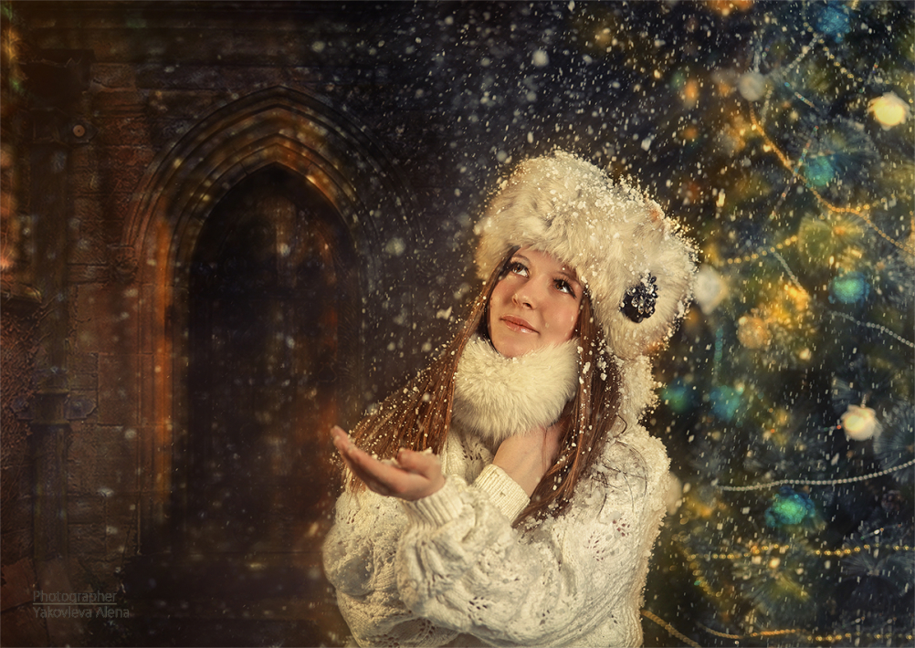 левая сторона- старинный замок(?), арка, правая - новогодняя елка. Безусловно, снег, новогодняя девушка и елка - это одна цельная картинка, а как оно компилируется с замком?