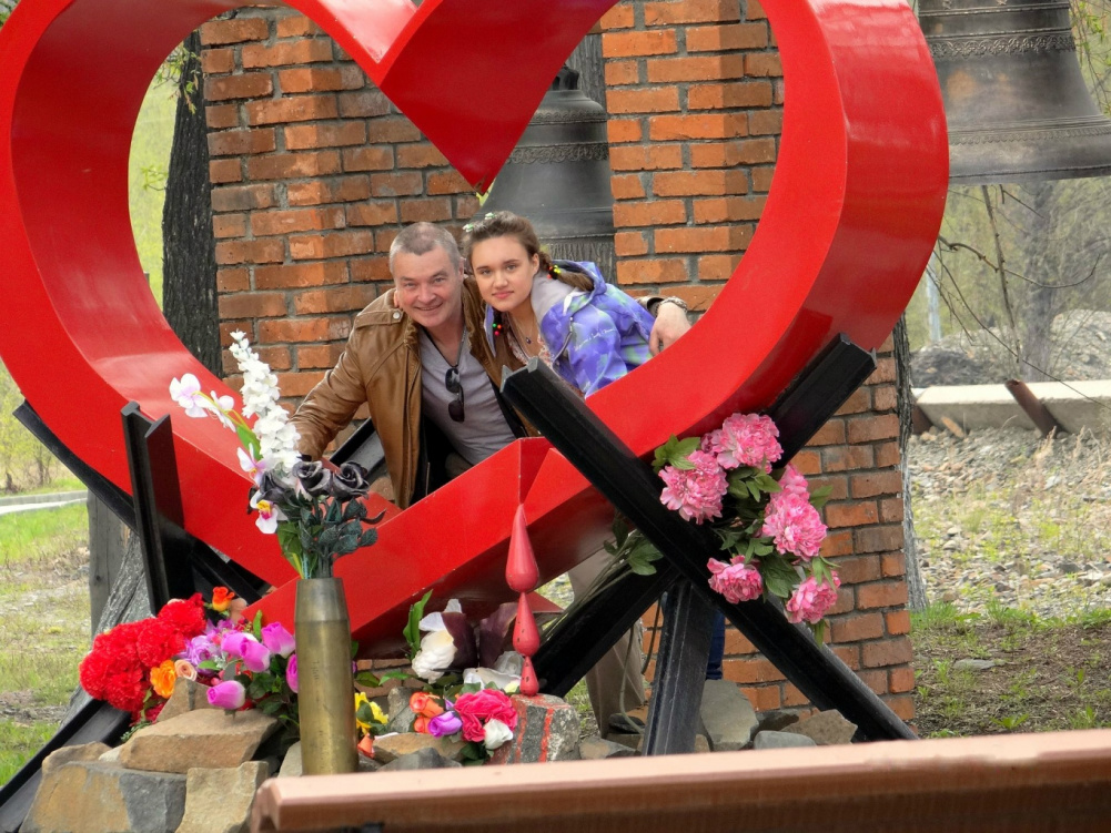 с улыбками на памятнике погибшим...