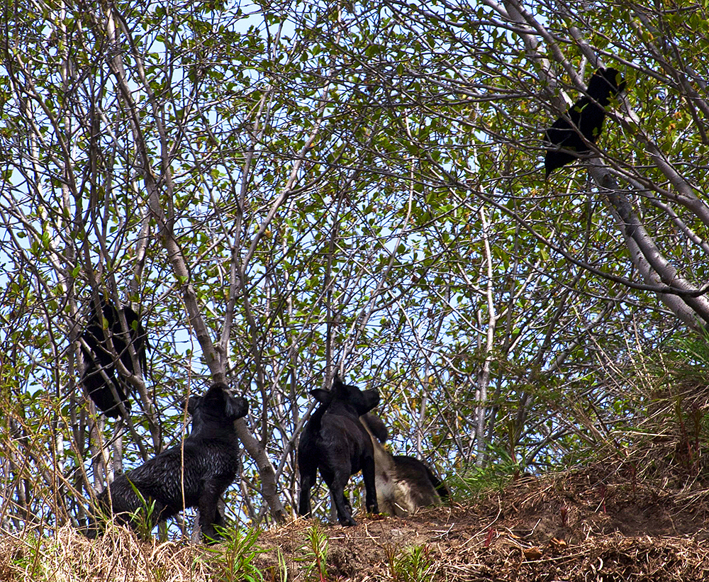 Уже не первый день, на одном месте, наблюдаю картину: два вОрона, сидят в кустах и развлекаются тем, что дразнят и передразнивают карканьем собачье семейство, причём пока один отвлекает на себя их своими ругательствами в их сторону, другой в это время облетает и из кустов чуть ли не садится собакам на спины... И вытворяется всё это без какой-либо агрессии, явно в развлекательных целях... :)