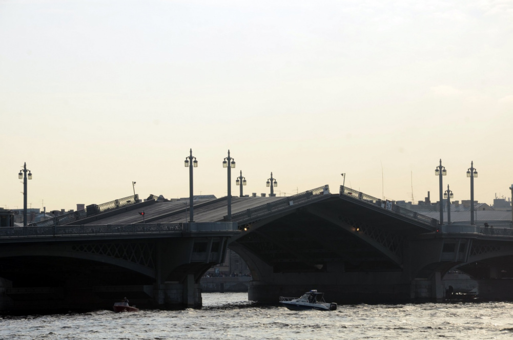 Почти сведённые створки Благовещенского моста после того, как Аврора прошла под ним на ремонт.