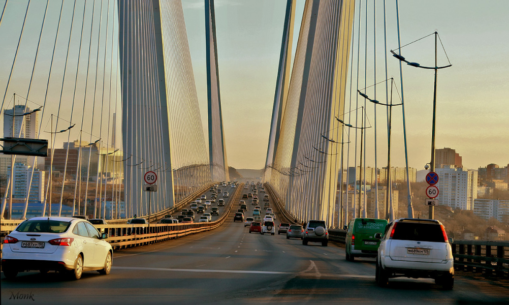 Да с машины, друзья устроили экскурсию по Русскому острову (через еще один мост)