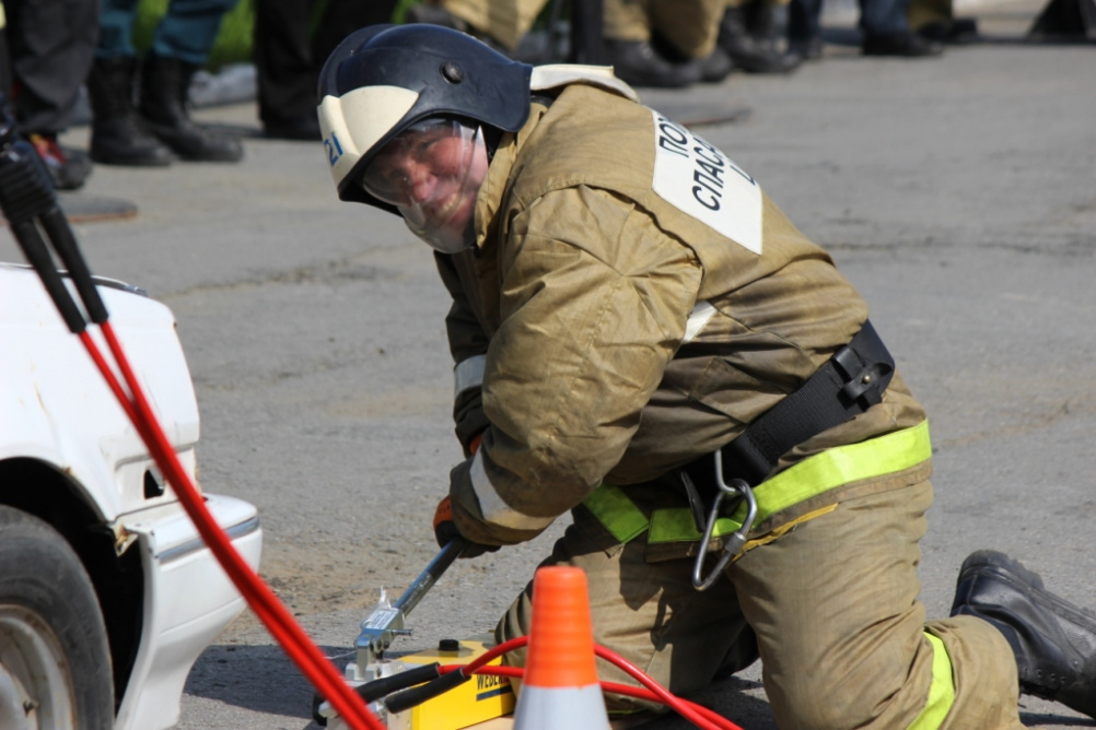 Соревнования по пожарно-прикладному спорту. Пожарный создает давление, для гидравлических ножниц для вскрытия аварийного автомобиля.