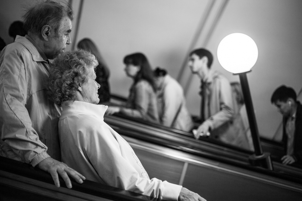 Они шли по станции метро, взявшись за руки. Он поддерживал её, хотя было видно, что он и сам устал. Они смотрели друг на друга с любовью, беседовали и улыбались.