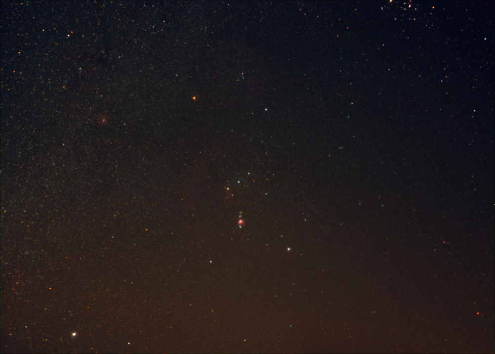 Орион с соседями). Красные пятна- это водородные облака Ориона. Под поясом война видна Большая Туманность Ориона, в поясе у звезды Альнитак -туманность конская голова и Пламя. в голове Ориона на грани виднеется огромное водородное облако красного цвета. Также слева от созвездия видна длинная красная полоса- это петля Барнарда. слева в Единороге красное пятно- туманность Розетта. На грани глюка видны очертания Ведьминой Головы. Хотел сделать глубокий снимок, не получилось, мало выдержки. Снято на водородный кенон. Общая выдержка около 30 минут, после запотел объектив)))