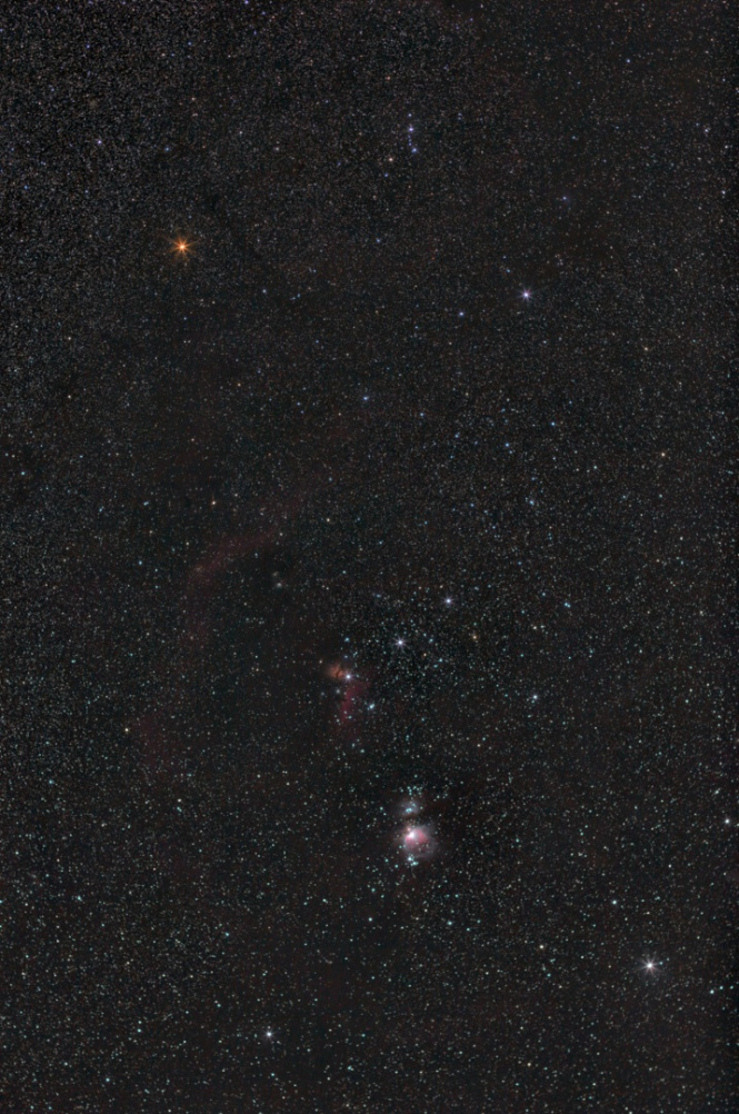 Созвездие Орион. Первые пробы нового canon 50mm 1.4. F2.2 оказалась вполне рабочей и пригодной для астрофото, ХА отсутствует, кома не большая. Отснято 108 кадров по 1 минуте, сложено и обработано. Фотоаппарат старый добрый canon 550d. Мороз -30. Уптар. Снимок более менее получился глубоким, видны множество туманностей, в том числе пылевые туманности. Для 108 минут получилось вполне ничего.