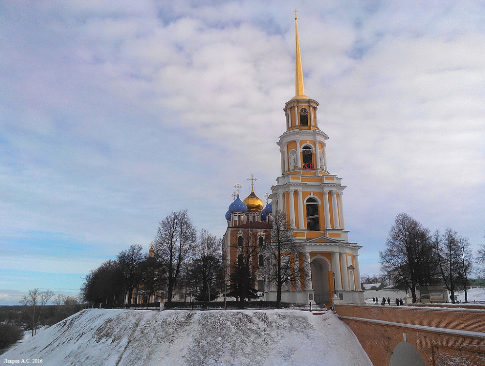 Четырехъярусная Колокольня высотой 83 метра с позолоченным почти 25-метровым шпилем выстроена в классическом стиле, и, несмотря на то, что создавалась она в течение более чем 50 лет (1789 – 1840 гг.) по проектам трех разных архитекторов: И. Ф. Русско, К. А. Тона и Н. И. Воронихина, общая композиция Колокольни с прекрасно найденными пропорциями шпиля сохранила единство и цельность выражения. Ее градостроительное значение для Рязани сравнимо со значением колокольни Ивана Великого для Москвы или построек А. Захарова для Санкт-Петербурга.