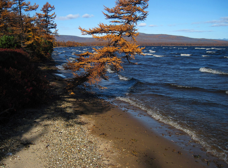 Осень.Озеро.Деревья на берегу.Одно дерево в стороне.