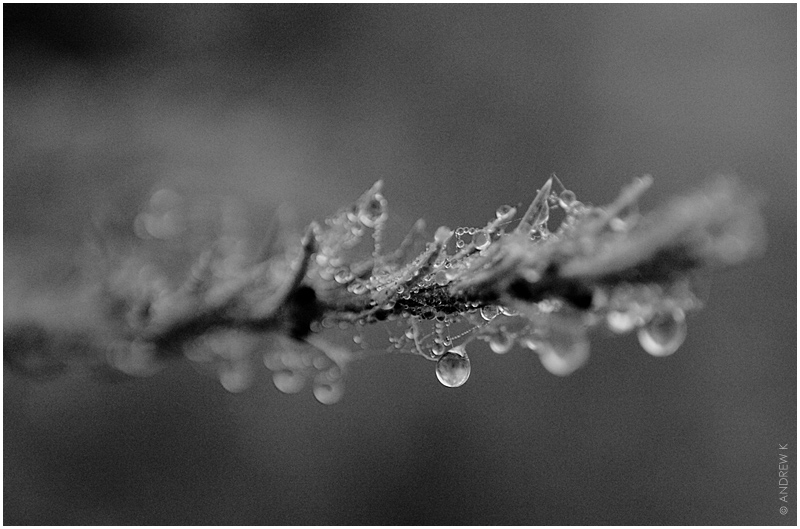 Веточка стланика, опутанная паутиной, с капельками росы.