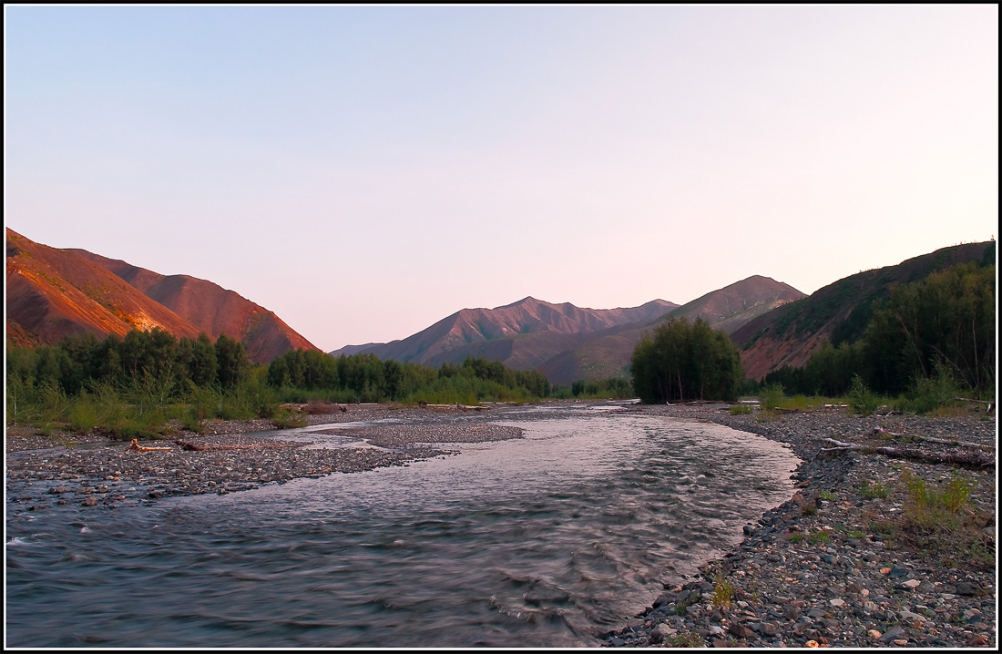 Сопки ещё согреты солнцем, а река уже в холодных сумерках. Загляденье