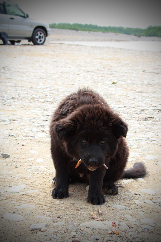Бездомного беднягу-щенка закормили костями так, что он рухнул спать прямо радом с нами на берегу. А кости на этой фотографии напоменают мне бивни мамонта (: