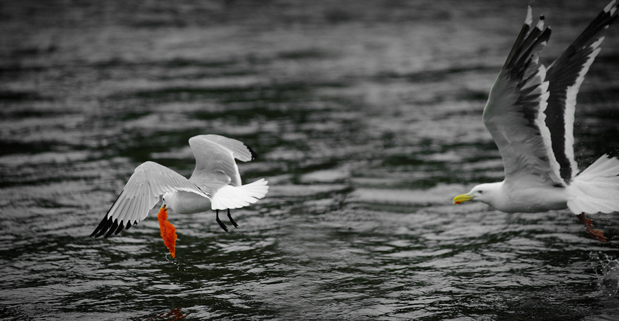 чайка схватившая у баклана из под носа ястык, чуть не распращалась с жизнью )))
