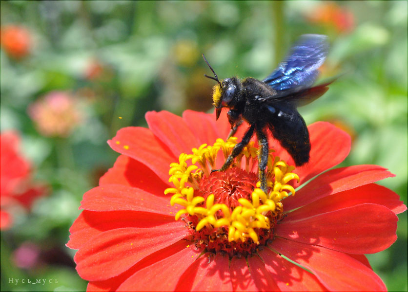 она больше шмеля в 2 раза, у неё гладкая глянцевая хм.. туловище) и красивейшие, играющие на свету синие крылья :)