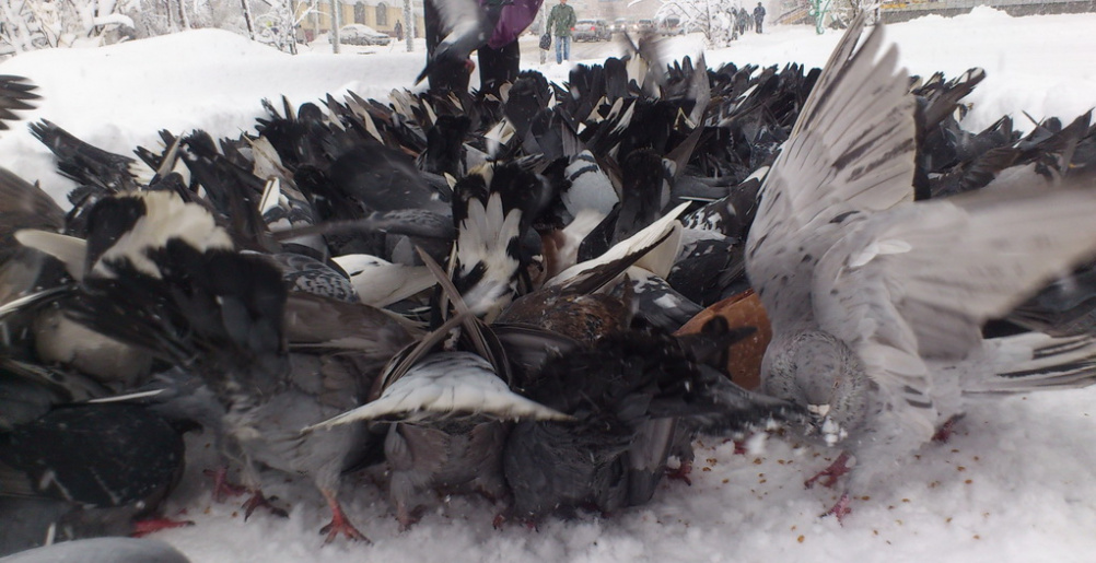 Бабушка кормит голубей на площади Космонавтов. Увидела, что я её фотогарфирую, И рассказала мне, что она каждый месяц тратит на них 1 тыс рублей на крупу, чтобы покормить голубей....Потом начала жаловаться на то, какая жизнь тяжелая, то людям это не надо и она одна поддерживает голубей нашего города))))) (ы)
