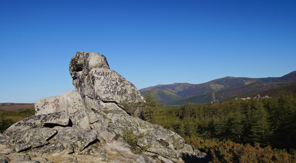 Надпись на вековых камнях,походу начертали краской самые и есть первые "олени".Конечно понятен посыл их до туристов ,отдыхающих на этом месте,но можно было и плакатик соорудить с табличкой,а не проявлять себя ,как пещерные люди этим художеством.