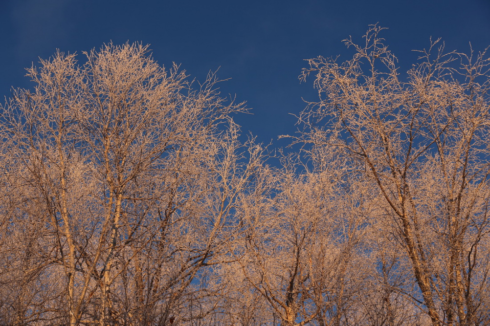Ближе к закату белый снег на деревьях преврашается в бежевый. Из обработки- только изменение размера.