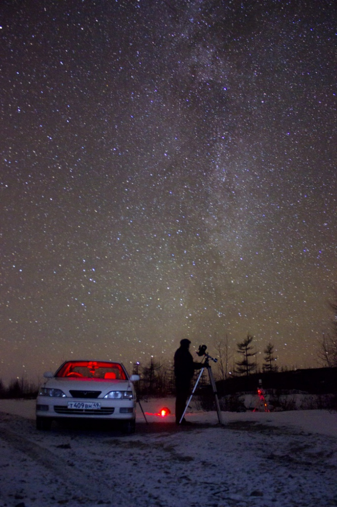 Наша астрономическая точка в 70 км от города. Небо там очень классное. На переднем плане мой хороший друг Иван Борода, а заднем плане виднеется астрограф.