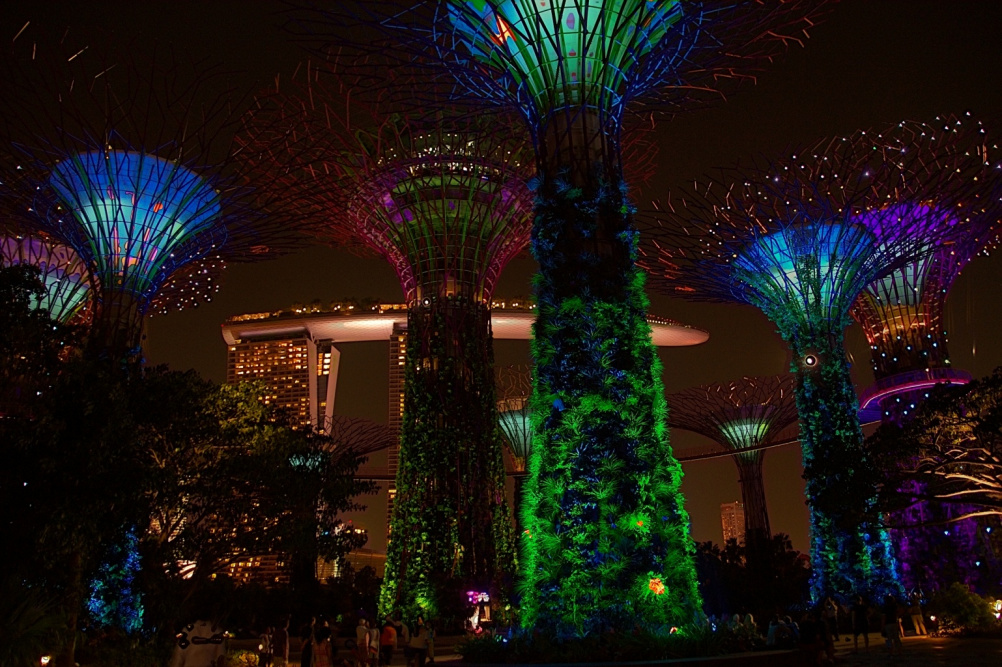 В саду "растут" 18 супердеревьев от 25 до 50 метров в высоту, питаемые электричеством от фотоэлементов, встроенных в конструкции и питающие сами себя, собирая воду от сингапурских проливных дождей.На супердеревьях растут 162900 растений более 200 разновидностей — папоротники, лианы, орхидеи...Световое Шоу называется OCBC Garden Rhapsody.Во время 15-минутной программы подсветка деревьев постепенно меняется, переливаясь всеми цветами радуги.Смотрится вживую очень красиво! (кликабельно)