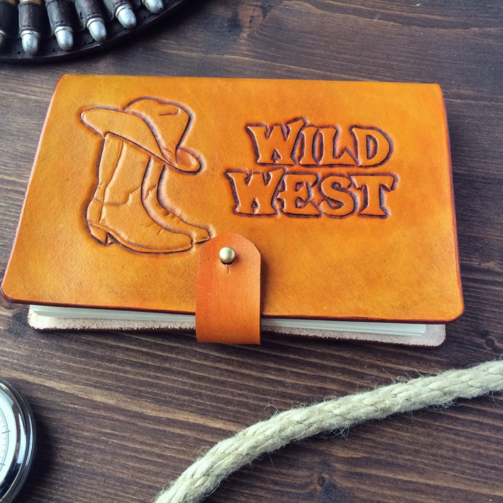 Блокнот из кожи ручной работы. Одна из любимых тематик моих - дикий запад. Внутри сменный блок дизайнерской бумаги на латунных винтах.