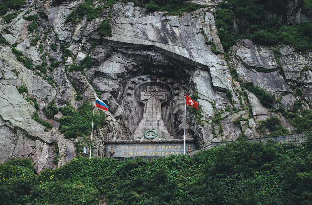 У основания креста-горельефа бронзовыми полуметровыми буквами текст эпитафии гласит: «Доблестным сподвижникам генералиссимуса фельдмаршала графа Суворова-Рымникского, князя Италийского, погибшим при переходе через Альпы в 1799 году.»