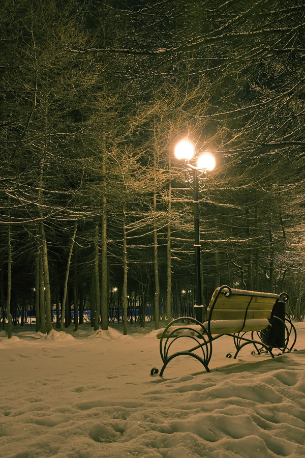 Столб из лавочки торчит, среди деревьев синий цвет явно лишний ,цвет неприятный,внизу кадра отвлекает большая вмятость на снегу.