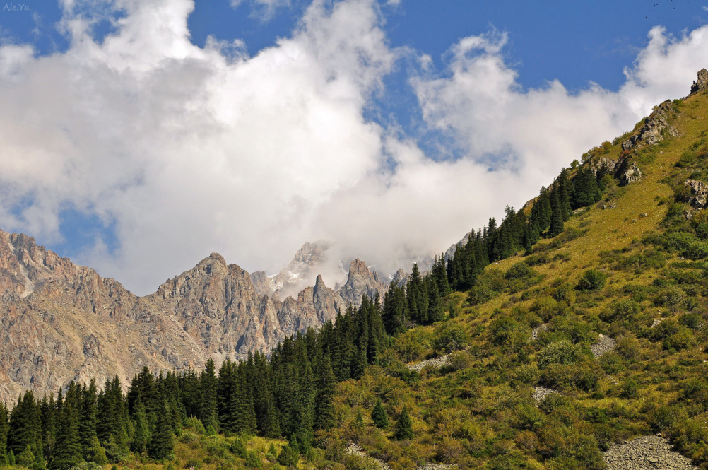 Родной Тянь-Шань, одно из красивейших мест на земле. Лет несколько назад учавствовал в восхождении на одну из вершин вблизи озера Ала-Куль - незабываемые впечатления =)