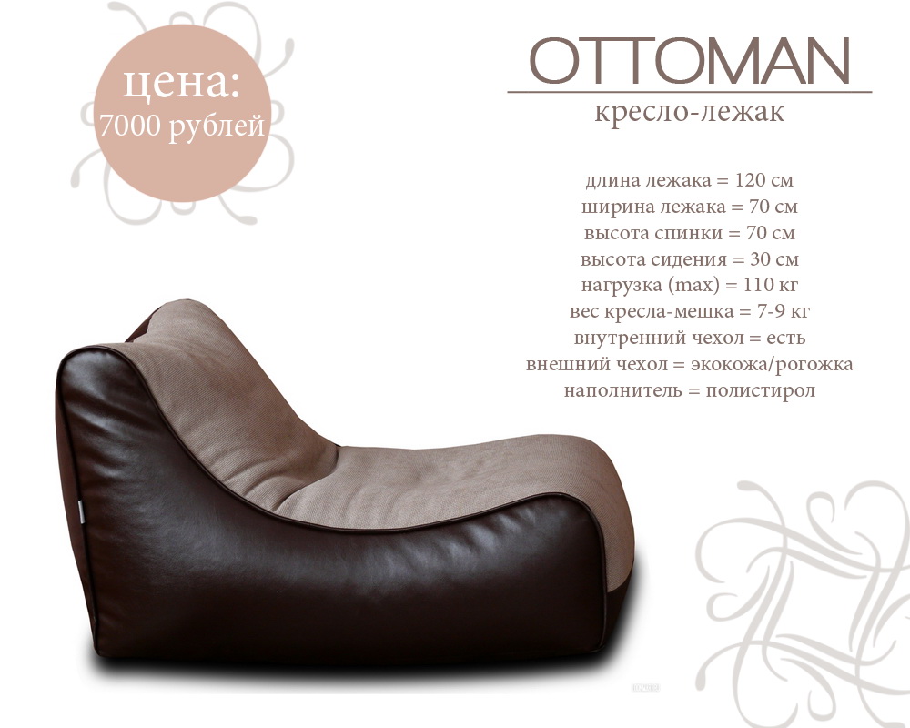 Оригинальное и очень удобное для лежания или сидения бескаркасное кресло "Оттоман". Размеров кресла достаточно для того, чтобы на нем мог свободно разместиться взрослый мужчина. Новая модель лежака идеально подходит для просмотра фильмов и ТВ, чтения книг и газет. Любители видеоигр могут также найти интересные применения этому оригинальному лежаку.