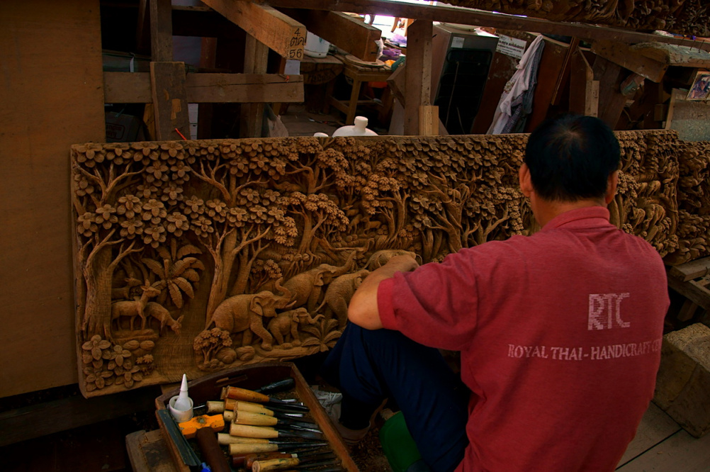 Резчик по тиковому дереву,так создаются тайские шедевры. Очень популярным сюжетом являются джунгли, растения и животные, которые окружали тайских мастеров на протяжении нескольких столетий.