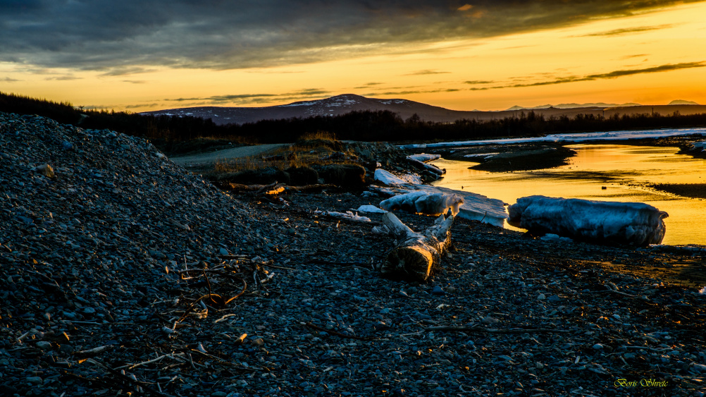 Раннее утро, восход солнца над Олой в районе Нюклинской косы