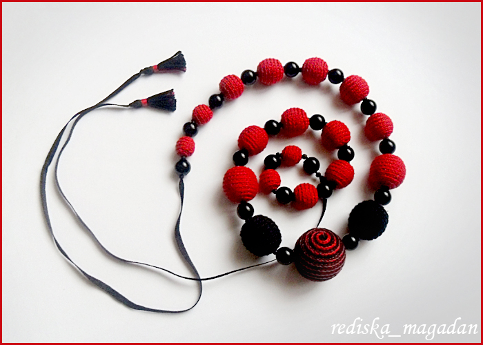 Обвязанные можжевеловые бусины, чёрные-пластик, крупный бисер. Атласная лента.