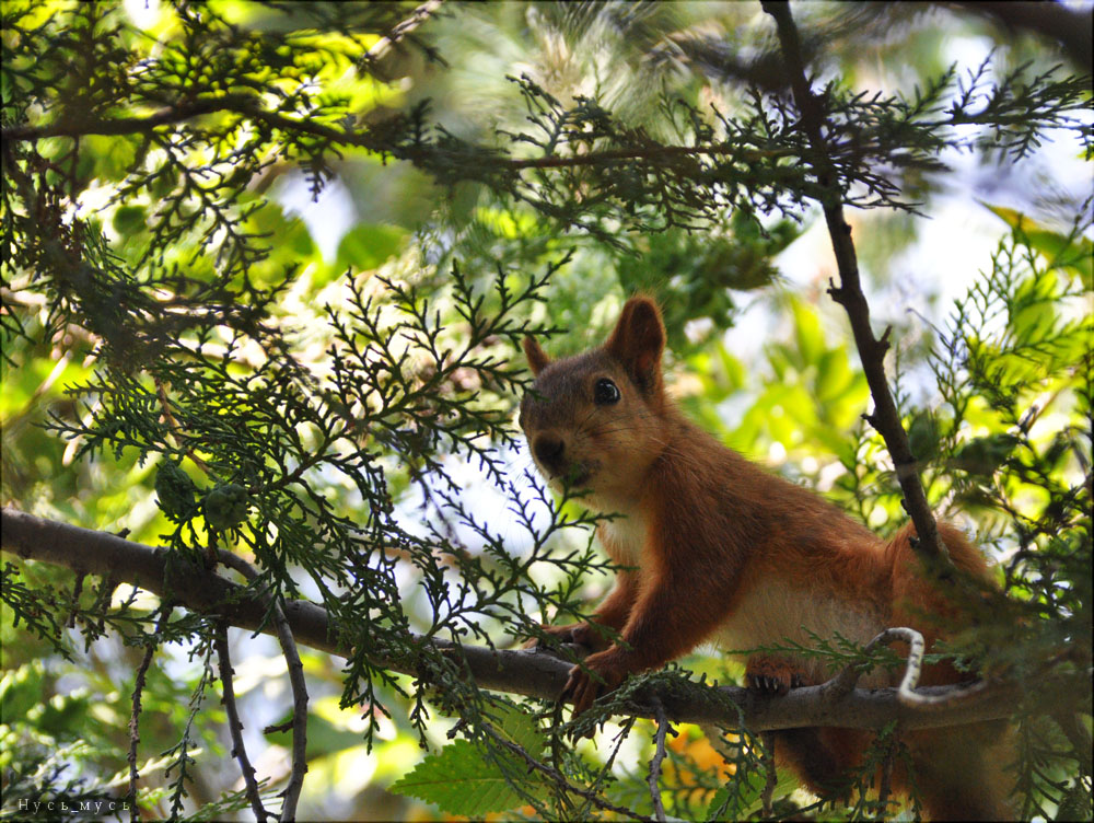 забравшись повыше, она увлеченно поедала тую, отчищая её как банан :)