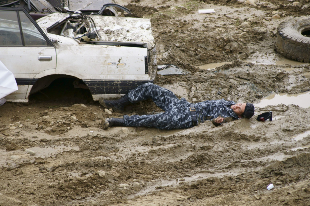 Гонки-2012,военный лазертаг,подстрелили парня,что поделаешь,а падать нужно,даже в грязюку)))